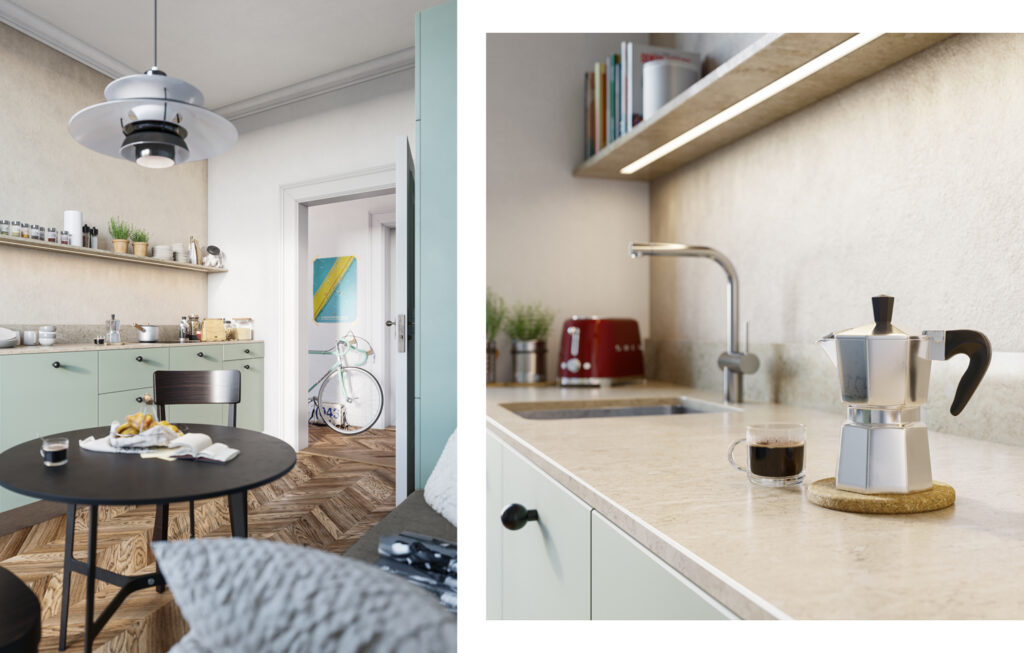Eine dieser Lebenswelten zeigt beispielsweise eine kleine, stylische Küche in einer schmucken Altbauwohnung. Darin lebt ein junges Paar, das Freude an gutem Design hat und finanziell noch keine grossen Sprünge machen kann. Die Küche ist klein, bietet aber trotz beschränkter Platzverhältnisse einen maximalen Komfort und fügt sich perfekt in die hohen Räumlichkeiten ein.