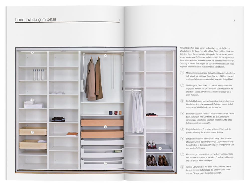 Um auch in weiteren Produktgruppen Fuss zu fassen will Stöcklin ein Sortiment an Wandschränken und Raumteilern einführen – Produkte, welche mit dem gleich hohen Qualitätsstandard wie die Küchenmöbel trumpfen sollen. Dazu braucht das Unternehmen einen neuen Katalog, welcher von Therefore konzipiert, gestaltet und umgesetzt wird. Das Resultat ist eine Präsentation, welche in klarer Struktur und mit schönen Bildern die Produkte ins rechte Licht setzt und bei Endkunden wie Schreinern gleichermassen gut ankommt.