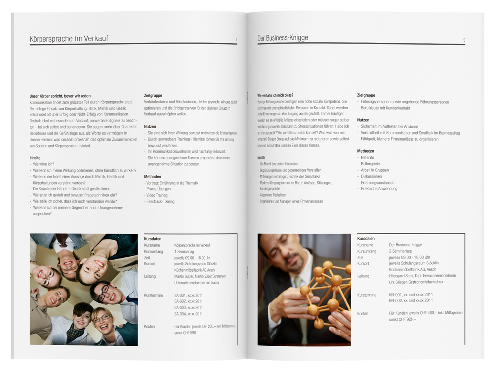 Therefore leitet aus dem Corporate Design von Stöcklin ein Layout für die Stöcklin Akademie ab und kreiert einen Katalog, der Ziele, Inhalte und Termine des Weiterbildungsangebotes übersichtlich darstellt. Passend dazu werden von der Kommunikationsagentur Mastervorlagen für das Schulungsmaterial erstellt. Küchenbauern, Schreinern und Händlern sollen ein auf ihre Bedürfnisse im Verkaufsalltag zugeschnittenes Seminarprogramm mit Themen aus Sales und Kundendienst erhalten. Auf allen Druckunterlagen befindet sich das neue Logo der Stöcklin Akademie. So wird der Seminarservice, der den B2B-Partnern zu einem geringen Unkostenbeitrag angeboten und ansonsten von Stöcklin gesponsert wird, optimal bei den Kunden verankert.