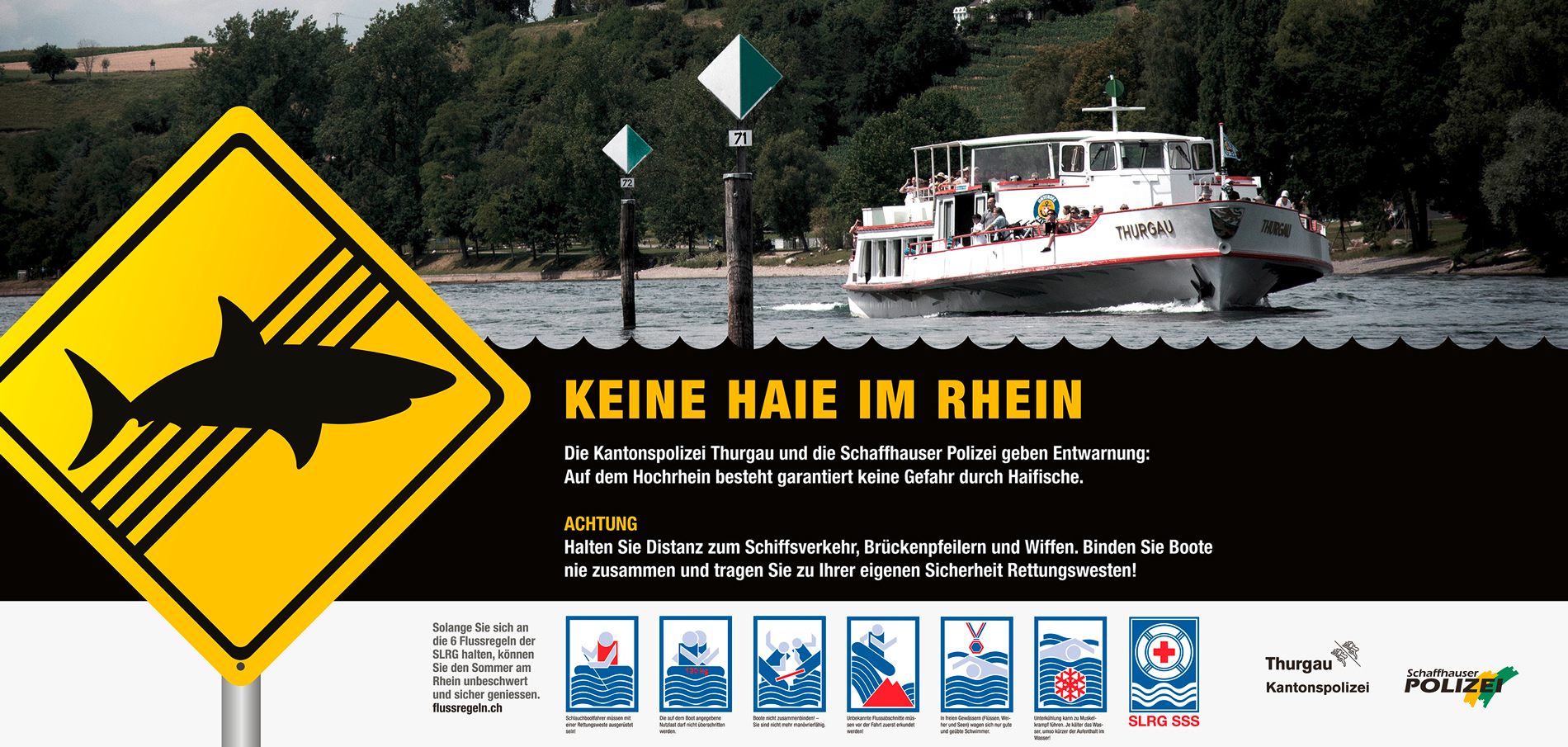 Die Idee war geboren: Therefore entwickelte das fiktive Key Visual einer australischen Hai-Entwarnung in Kombination mit dem Claim «Keine Haie in unseren Flüssen». Das als Warnsignal gestaltete Sujet funktioniert sowohl auf Schildern an den jeweils kritischen Badestellen als auch beim Einsatz in klassischen Medien und online. Mit der von der Polizei als Absender verbreiteten „Hai-Entwarnung“ weckt das Motiv auf kreative Art Interesse und schafft eine hohe Aufmerksamkeit. Dabei macht es klar deutlich, welche potentiellen Gefahren bestehen, für welche keine ausdrückliche Entwarnung gegeben werden kann. Die Kampagne setzt also auf einen bewussten Appell an den gesunden Menschenverstand statt auf ein Verbot.