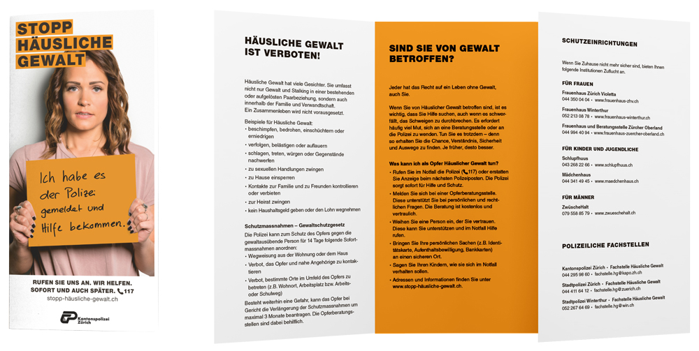 Die bestehende Landingpage der Kantonspolizei Zürich wurde dementsprechend angepasst und wird nun durch die Plakate im S-Bahn-Netz des Kantons offensiv beworben. Unterstützung erhält die Plakatkampagne von Print-Inseraten, Web-Bannern und Flyern. Letztere wurden in sieben Sprachen übersetzt. So erhalten Opfer, Täter und Angehörige die wichtigsten Informationen auf einen Blick. Einfach, zielgerichtet und verständlich, versteht sich.